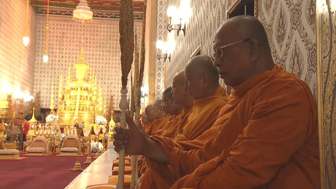 His Majesty the King then lit incense and candles on a two-tiered golden tray to pay homage to the Buddha image representing his day of birth in front of the Phra Noppapat Maha Sewetachat Throne. He then paid his respects and sat on his royal throne. His Majesty the King then presented 11 sets of robes to the monks and listened to the sermons. Afterwards, he poured water on the alms bowl. The monks offered blessings, made offerings, and bid farewell. After leaving the throne, officials invited the monks in 11 rounds, 2 rounds, and 10 rounds, 6 rounds. They then sat on the monks' seats and presented the robes to the monks and listened to the sermons. He continued this process until the final round, with 93 monks in attendance.