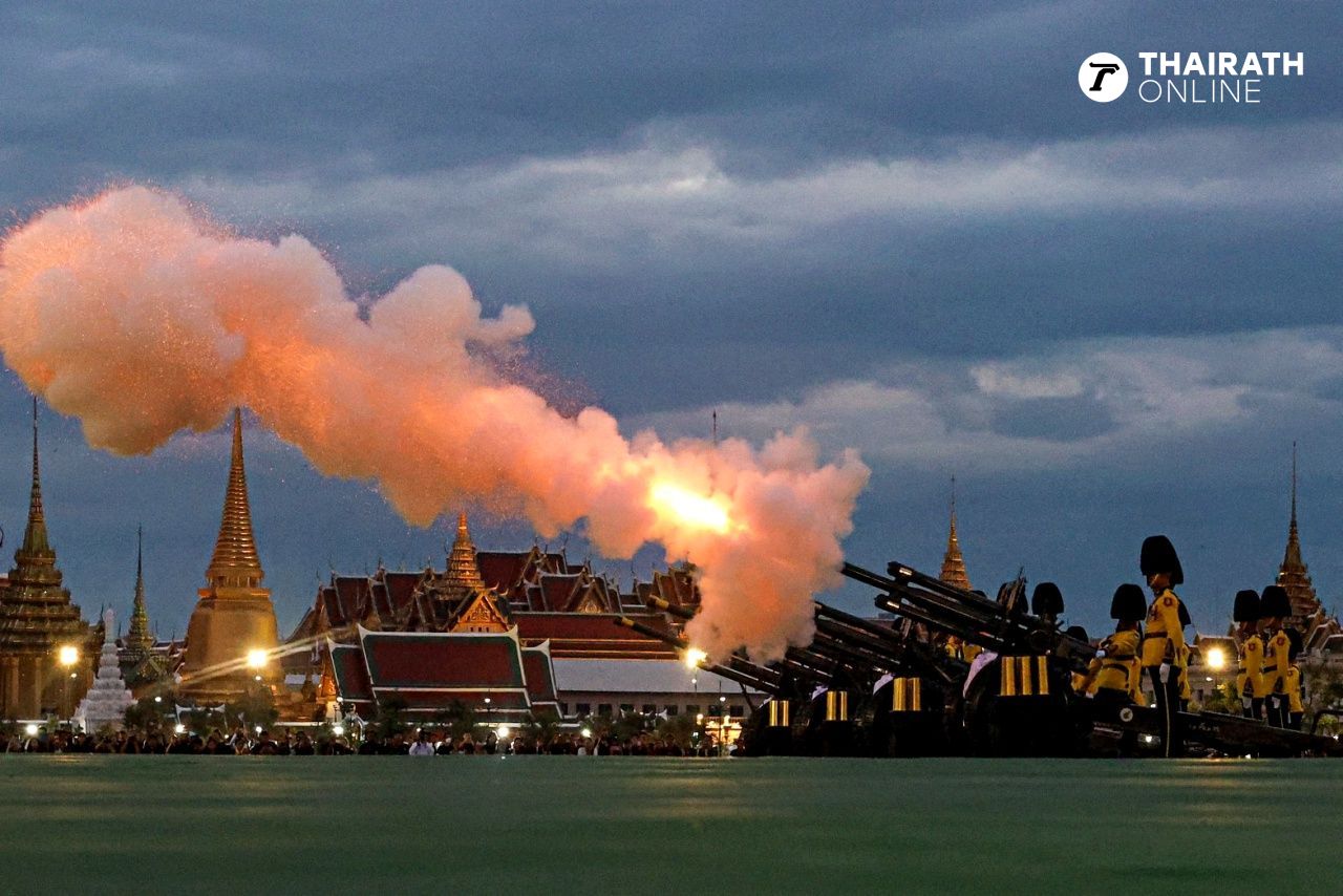 The King and Queen led members of the Royal Family in performing merit-making ceremonies by inviting the royal urn of Her Majesty the Queen Mother to be enshrined at Dusit Maha Prasat Throne Hall. They offered robes to 93 monks. Artillery soldiers fired a salute in honor of Her Majesty.