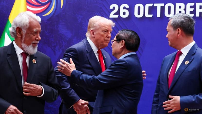 East Timor's Prime Minister Xanana Gusmao (left) and Cambodia's Prime Minister Hun Manet (right) look on as Vietnam's Prime Minister Pham Minh Chinh greets US President Donald Trump during a group photo at the US-ASEAN Summit in Kuala Lumpur on Oct 26, 2025. (Photo: Reuters/Evelyn Hockstein)