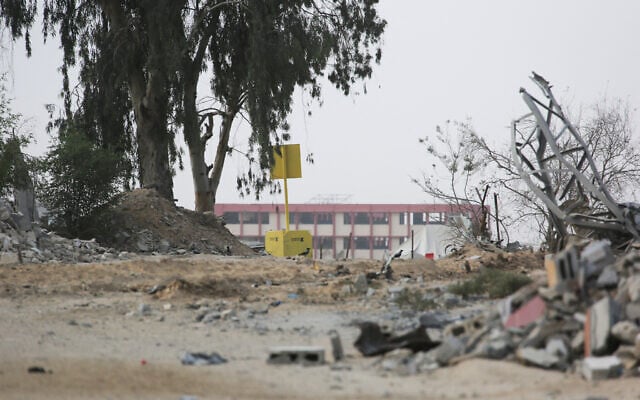 A general view of a yellow concrete block marking the Yellow Line in Gaza, seen near the central Gaza Strip’s Bureij refugee camp, November 4, 2025. (Bashar Taleb/AFP)