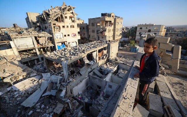 A boy looks at the rubble of buildings destroyed in an Israeli strike in Bureij, central Gaza Strip, on October 20, 2025. (Eyad BABA / AFP)
