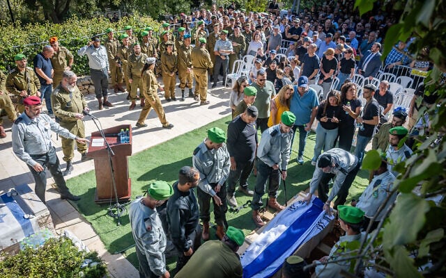 Maj. Yaniv Kula is interred at the Mount Herzl Military Cemetery in Jerusalem, October 20, 2025. (Yonatan Sindel/Flash90)