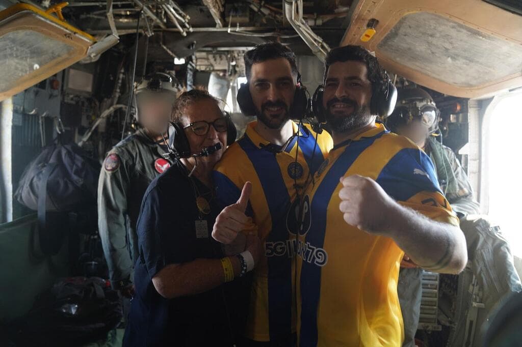 The helicopter of Gali and Ziv Berman, die-hard Maccabi Tel Aviv fans, will pass over Bloomfield. In anticipation of its arrival, Maccabi Tel Aviv fans placed signs in the middle of the field with their picture and that of Omri Miran, also a fan of the team.