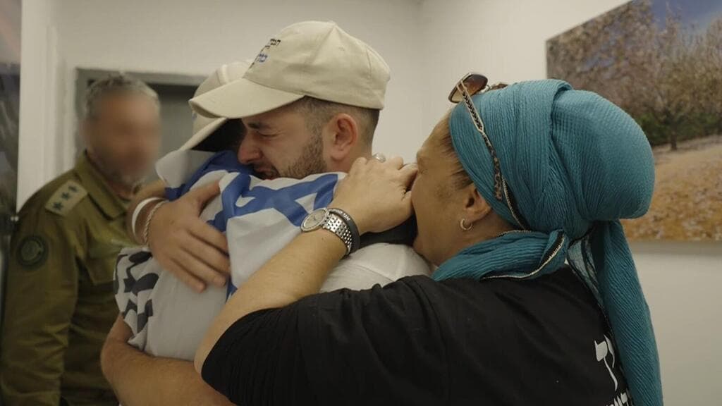 The IDF has released the first footage of Eviatar David after his release from captivity in Gaza - the first footage since the shocking video released by Hamas in August, in which Eviatar appears emaciated and starving and forced to dig his own"grave." In the footage, he still looks thin, but is standing on his feet and talking to the soldiers. Watch the video and the videos that were released of the moments of bonding with the returnees Bar Kuperstein and Eitan Mor.