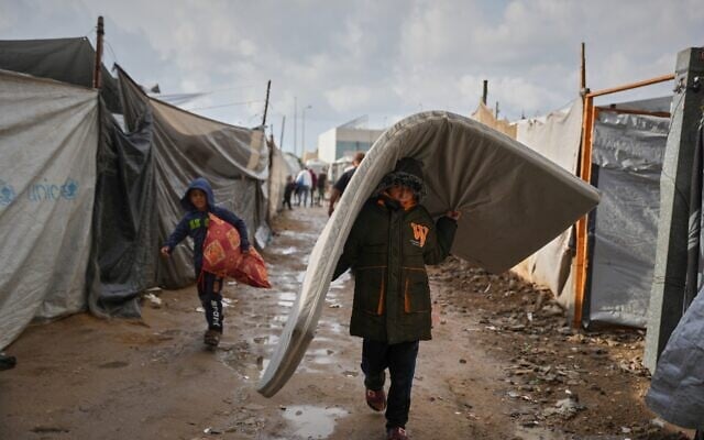Salam Musa, 9, carries a mattress as he walks between tents after rainfall at a temporary camp in Deir al-Balah, in the central Gaza Strip, on Friday, November 14, 2025. (AP/Abdel Kareem Hana)