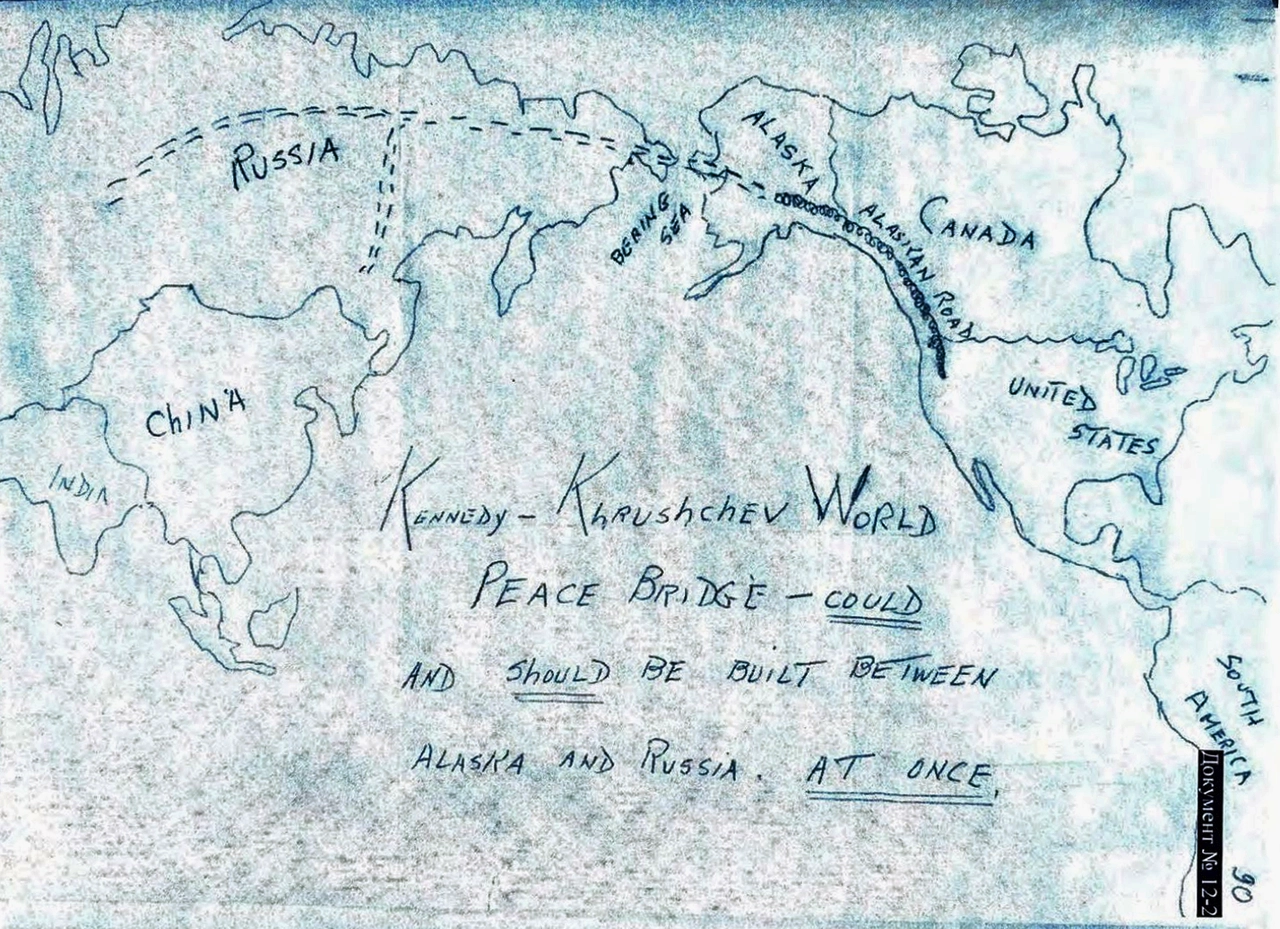 In another post supporting the idea Dmitriev published a hand drawn proposal made 65 years ago, which was allegedly retrieved from a Moscow archive dedicated to the 35th US President John F. Kennedy, in which he outlined a plan for a Soviet-American project to be called the “Kennedy-Khrushchev World Peace Bridge” According to notes scribbled on the paper, JFK demanded the project should begin “at once.”