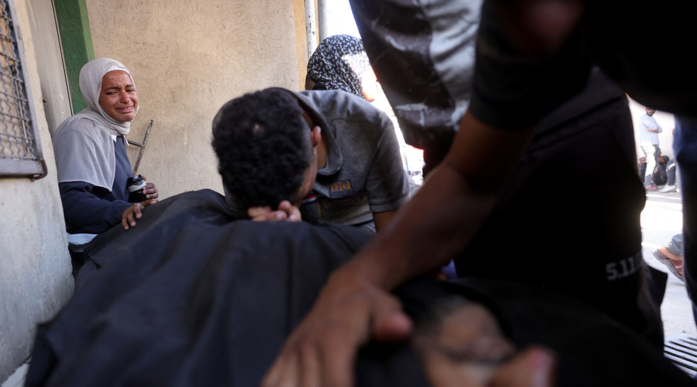 Friends and relatives mourn over the shrouded body of a man killed in an Israeli strike in the central Gaza Strip on October 19, 2025. (AFP)