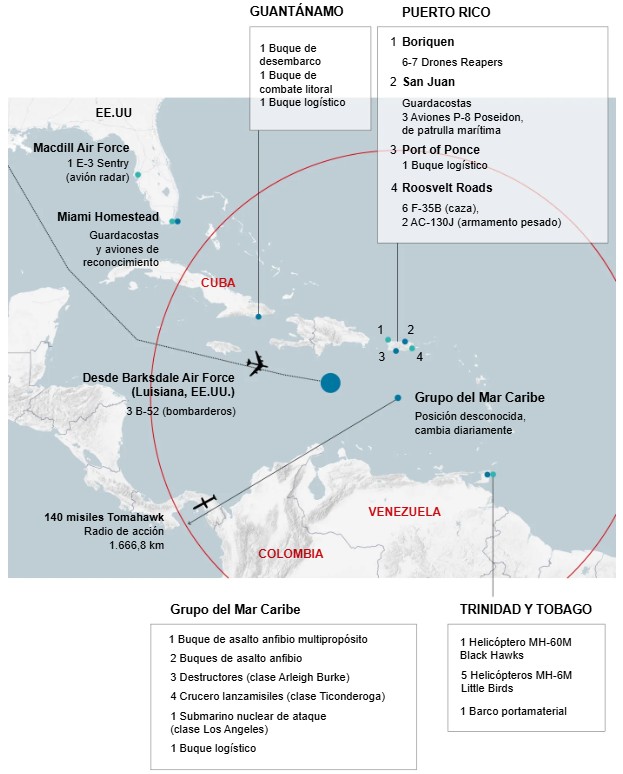According to the current tally by the Trump administration and several allies in Congress, there are now more than 10,000 troops in the region. Strategic bombers are operating from bases in Louisiana and Puerto Rico, state-of-the-art fighter jets are on escort missions, missile-armed ships are in position, and special operations units are deployed between Puerto Rico and Trinidad and Tobago.