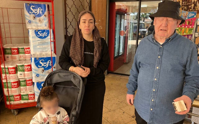 Lian Biton, left, stands with her daughter and a relative, Yitzhak Peretz, in front of the grocery store in Avivim on November 26, 2025. (Diana Bletter/Times of Israel)