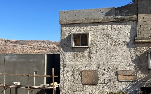 Work is underway to construct a new bomb shelter next to a house that was heavily damaged during the 2023-2024 Israel-Hezbollah conflict in Avivim, northern Israel, on November 26, 2025. (Diana Bletter/Times of Israel)