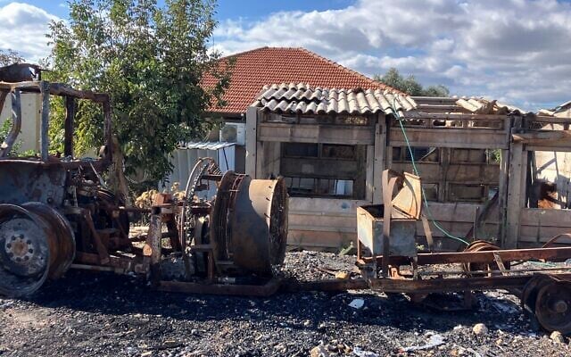 Farm equipment and structures that were destroyed by Hezbollah rocket attacks, yet to be restored, on November 26, 2025. (Diana Bletter/Times of Israel)
