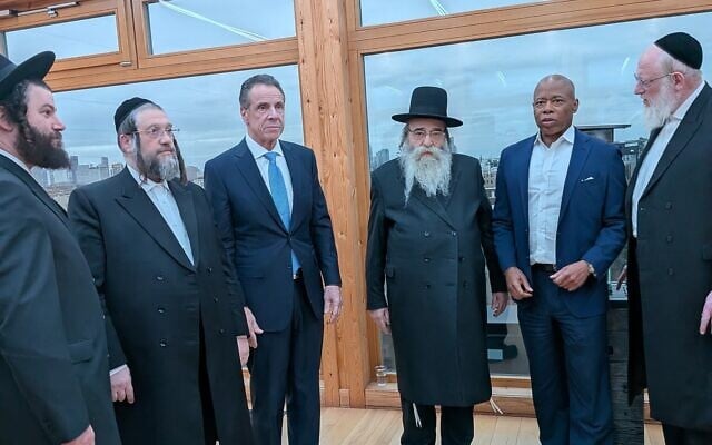 Former New York governor Andrew Cuomo, center left, and New York City Mayor Eric Adams, center right, meet with Satmar leaders, October 29, 2025. (Courtesy)