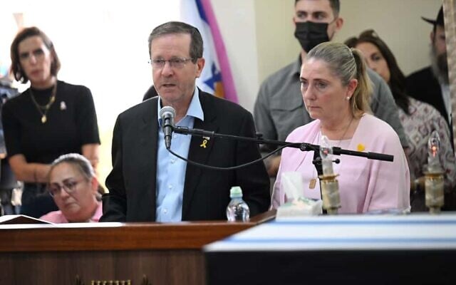 Addressing the Haiman family, Herzog asked for “forgiveness that we were not there for you. Forgiveness that we could not save you. Forgiveness that it took us so long to bring you home.”