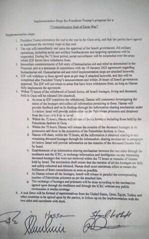 A document entitled “Implementation Steps for President Trump’s Proposal for a ‘Comprehensive End of Gaza War,'” signed by representatives of Israel (Ron Dermer), Hamas and mediating nations in Egypt on October 9, 2025. (Kan News)