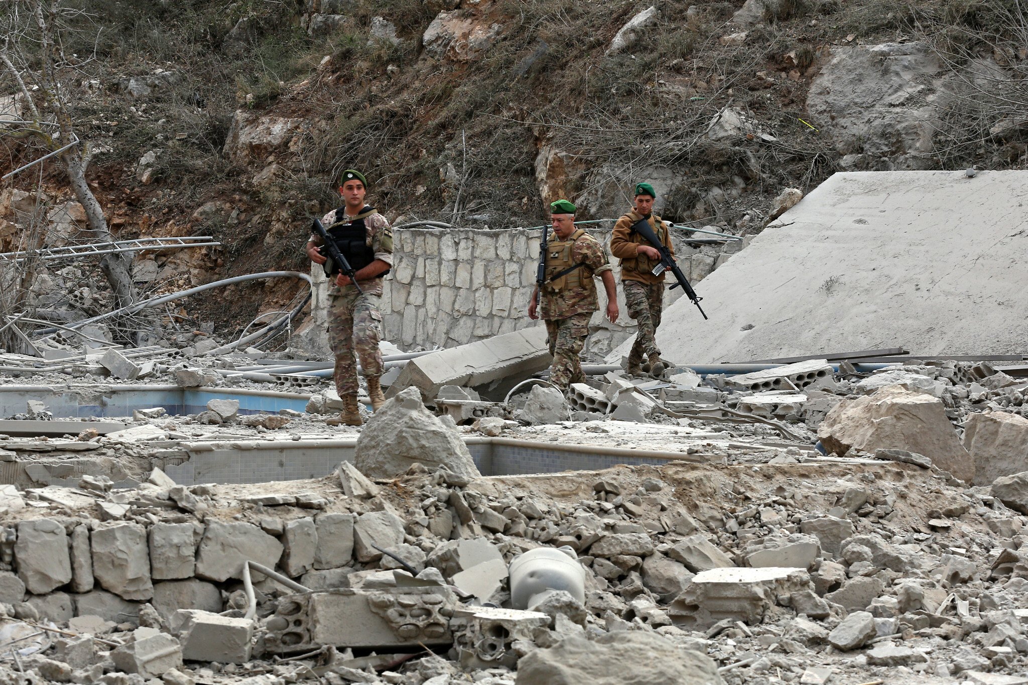Lebanese army soldiers inspect the site of an Israeli airstrike in the southern Lebanese village of Tair Felsay near the Litani River, early on November 13, 2025. (MAHMOUD ZAYYAT / AFP)