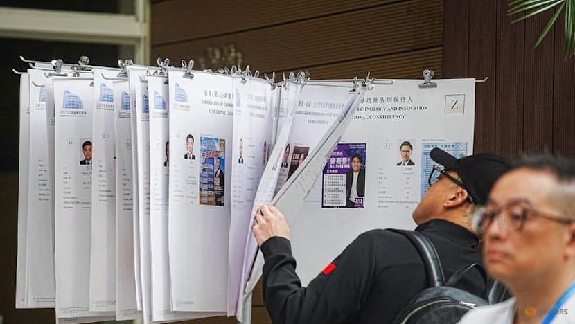 A voter checks on the candidates at a polling station in Tai Po during the Legislative Council general election in Hong Kong, China, Dec 7, 2025. (PHOTO: REUTERS/Lam Yik)