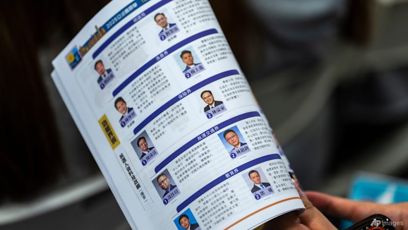 People look at a candidate brochure of the Hong Kong Legislative Council General Election at a forum in Hong Kong on Wednesday, Dec 3, 2025. (PHOTO: AP/Chan Long Hei)