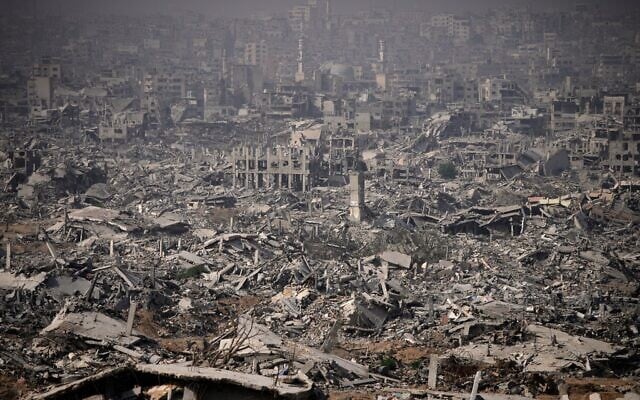 Buildings destroyed in the war between Israel and Hamas lie in ruins around the Shejaiya neighborhood of Gaza City, during an IDF-organized tour for journalists, November 5, 2025. (Ohad Zwigenberg/AP)