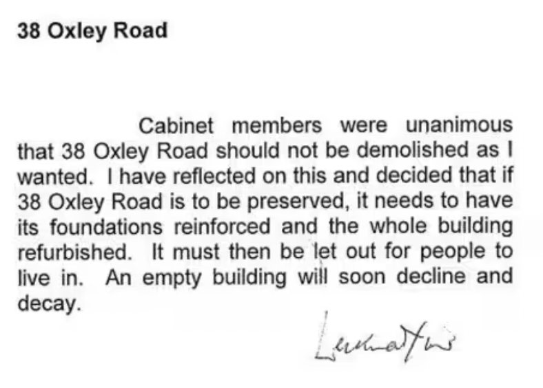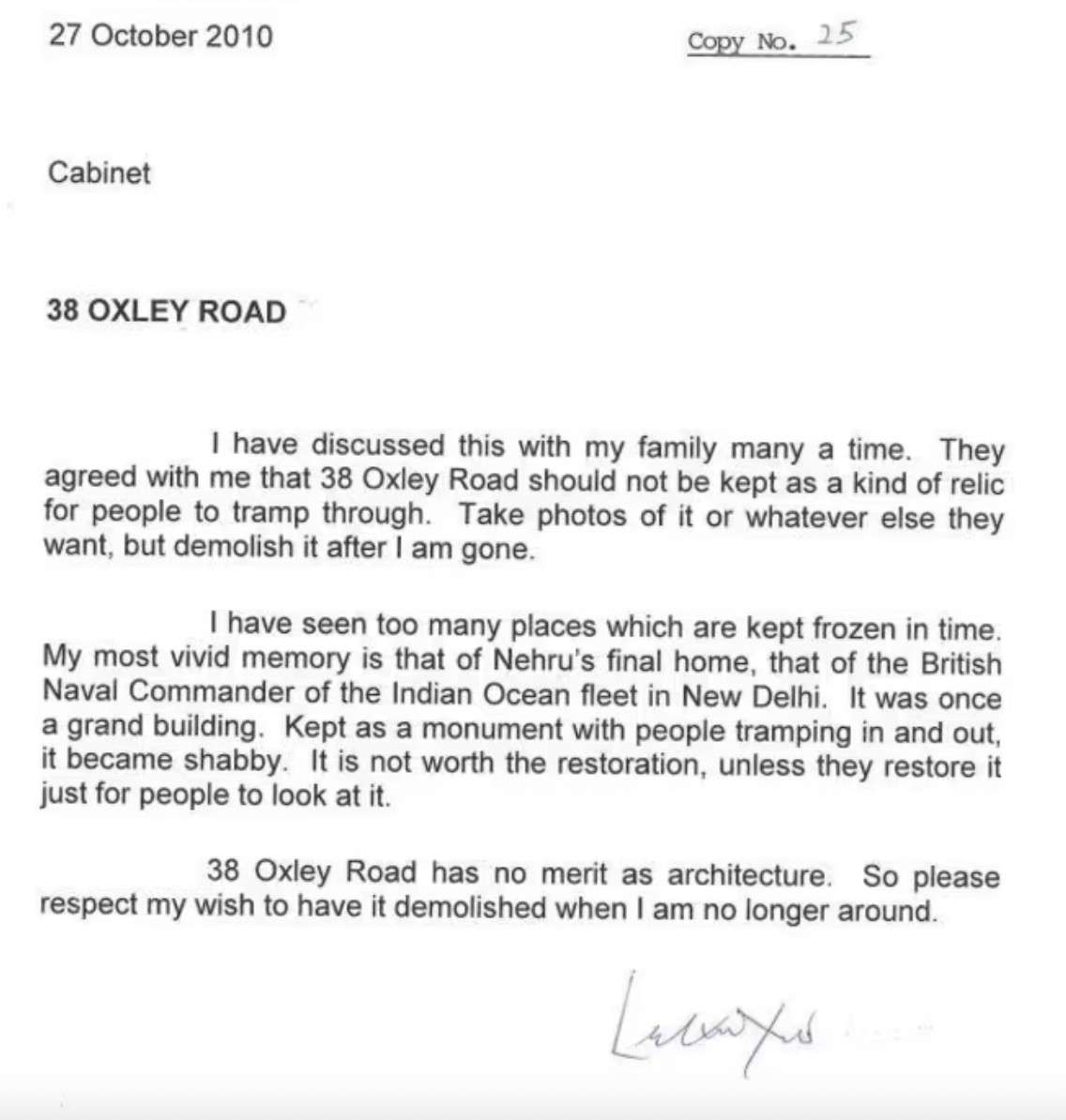 “38 Oxley Road has no merit as architecture. So please respect my wish to have it demolished when I am no longer around.”