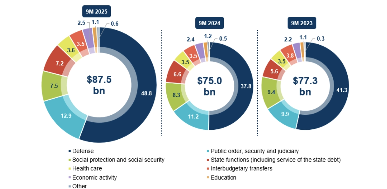 Defense and security expenditures continued to dominate the budget, accounting for 70.5% ($61.7 billion) of total spending in the first nine months of 2025, according to estimates by the Kyiv School of Economics (KSE).