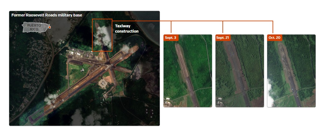 Work at the former Roosevelt Roads naval base in Puerto Rico —closed by the Navy more than 20 years ago— began on September 17, when crews started cleaning and repaving the taxiways leading to the runway, according to photographs taken by Reuters.