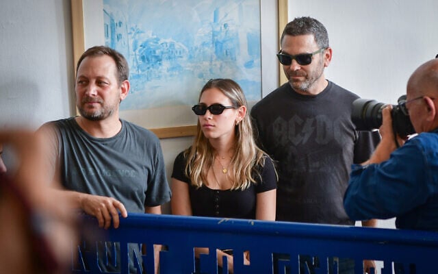 The family of former military advocate general Maj. Gen. Yifat Tomer-Yerushalmi arrives at her court hearing at the Tel Aviv Magistrate’s court in Tel Aviv, on November 3, 2025. ( (Avshalom Sassoni/Flash90)