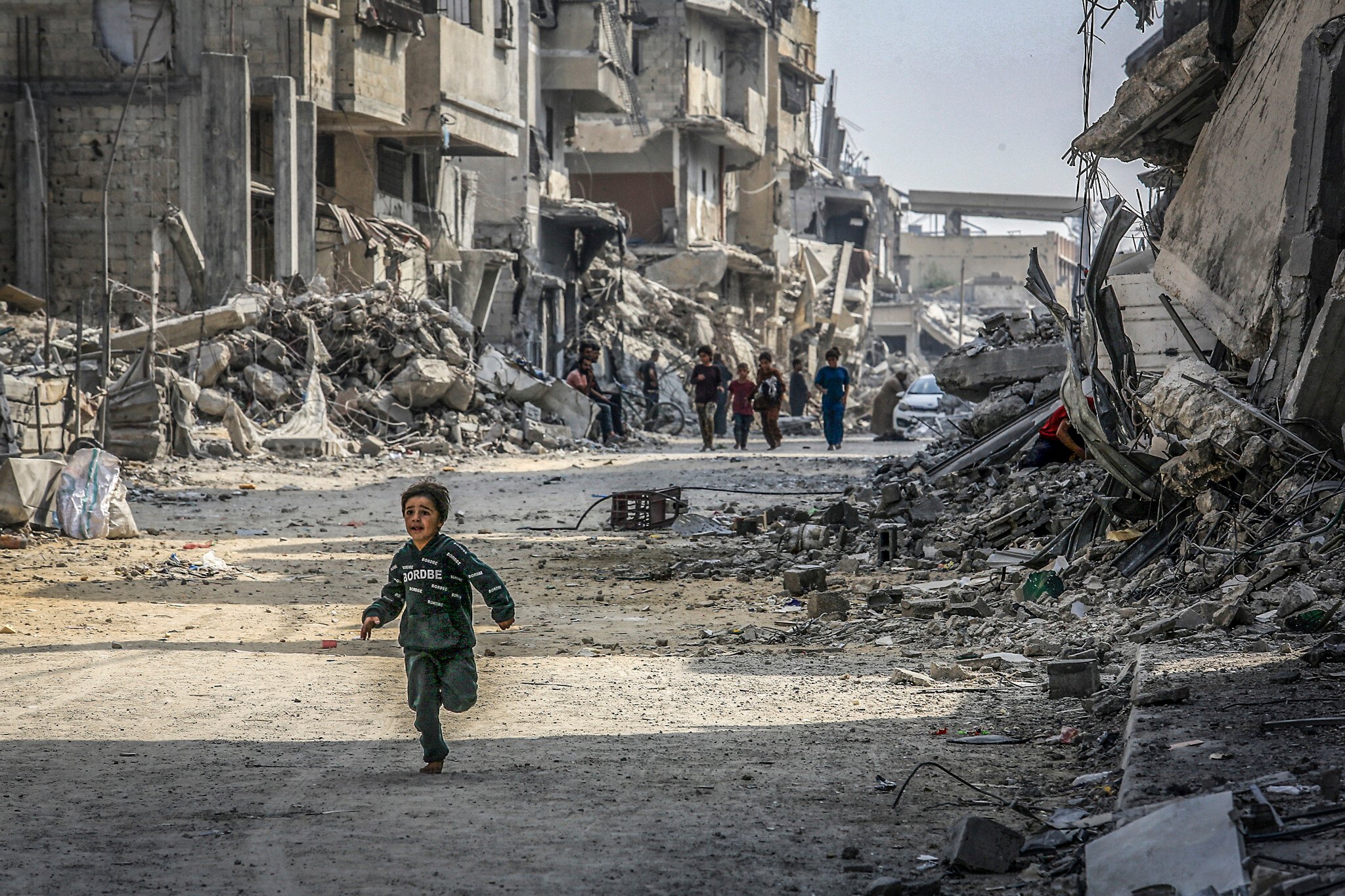 A Palestinian child runs past buildings destroyed in the Gaza war, in Khan Yunis, southern Gaza, November 6, 2025. (Abed Rahim Khatib/Flash90)