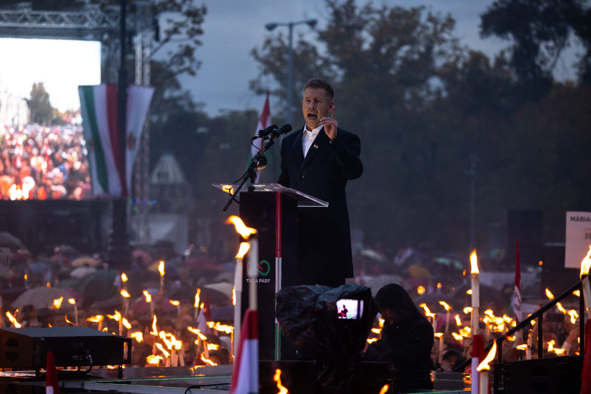 In Karmelita, they may believe that the future of Hungary will be decided by the propaganda of power and its discrediting machinery. We send a message from where everything started in 1956, when the people toppled the dictator's statue. We send a message that history is not decided in castles and manor houses, not on private planes and yachts. The fate of the Hungarian people cannot be decided in Brussels, but neither in Washington nor in Moscow. History is written by Hungarian people, Hungarian people in Hungarian squares and Hungarian streets, when they choose hope instead of fear and start clinging to each other. My dear friends, the Hungarian nation can only be free and independent, or, to use a fashionable word, sovereign, if the responsible leaders of our country do not beg the leaders of other nations for more kicks or a propaganda photo. If we look deeply into ourselves, we can see it. In the past two decades, October 23 has been a harsh holiday, because our country's leaders, in private, tried to draw false parallels exclusively in front of their own followers. How could someone who experienced 1956 as a counter-revolution as a family be able to speak honestly about the revolution? And how could someone who paraded revolutionary words in 1989 be sincere in their celebratory speech, while it has now become clear that the only problem with the first system, the previous system, was that he was not in charge of it. How could they have celebrated proudly when they cannot even answer the simple question that all heroes of 1956 answer in unison. What does this country mean to those who truly love it? The young Viktor Orbán, the dictatorship in its final days, was allowed onto the steps of the Műcsarnok to deliver his speech at the reburial of Imre Nagy and his fellow martyrs. 36 years later, they are so terrified, they have sunk to the point that they have forbidden this speech today, commemorating the change of regime, to be delivered on the steps of the Műcsarnok.