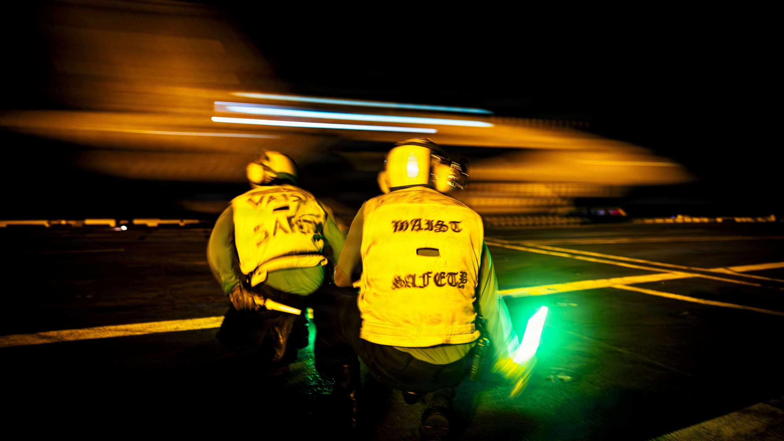 Pilots and crew members work in low visibility conditions, using directional lights and state-of-the-art equipment to simulate real combat scenarios.