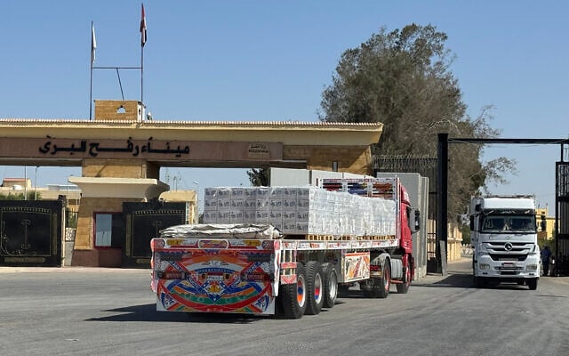 A truck loaded with humanitarian aid waits to cross from the Egyptian side of Rafah en route to the Kerem Shalom crossing into the Gaza Strip on October 20, 2025 (AFP)