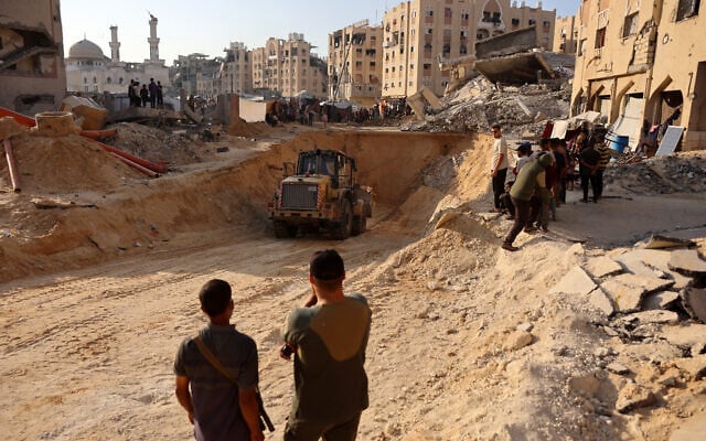 People watch as Palestinians use an excavator to dig deep into the ground, reportedly searching for bodies in Khan Younis in the southern Gaza Strip on October 17, 2025. (Omar AL-QATTAA / AFP)