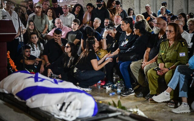 Family and friends of slain hostage Eitan Levy attend his funeral at the Holon-Bat Yam Cemetery, October 16, 2025. (Avshalom Sassoni/Flash90)
